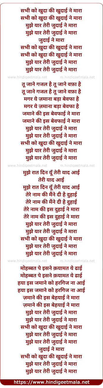 Lyrics of Sabhi Ko Khuda Ki Khudayi Ne Mara - सभी को खुदा की खुदाई ने मारा