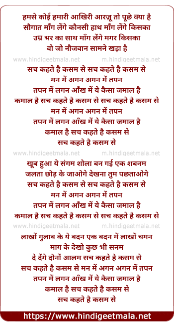 Lyrics of Sach Kehte Hai Kasam Se Mann Me Agan - सच कहते है कसम से मन में अगन