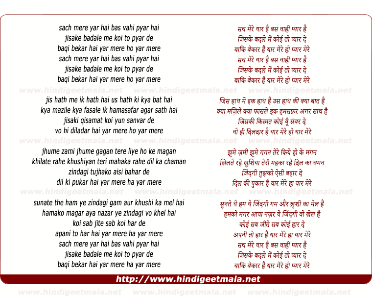 Lyrics of Sach Mere Yaar Hai Bas Vahi Pyaar Hai - सच मेरे यार है बस वही प्यार है