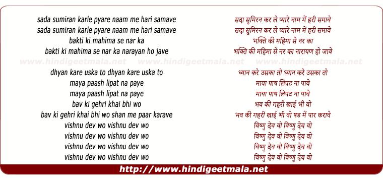 Lyrics of Sada Sumiran Karle Pyare - सदा सुमिरन करले प्यारे