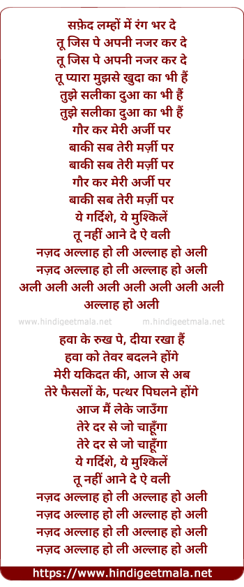Lyrics of Safed Lamho Me Rang Bar De (Allah-O-Ali) - सफ़ेद लम्हों में रंग भर दे