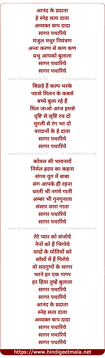 Lyrics of Sagar Padhariye - आनंद के प्रदाता