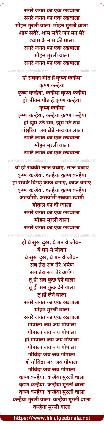Lyrics of Sagre Jagat Ka Ek Rakhwala (Female) - सगरे जगत का एक रखवाला