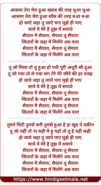 Lyrics of Saiyaara Mai Saiyaara, Saiyaara Tu Saiyaara - सैयारा मैं सैयारा, सैयारा तू सैयारा