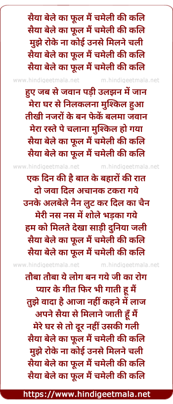 Lyrics of Saiyya Bele Ka Phool Mai Chameli Ki Kali - सैया बेले का फूल मैं चमेली की कलि