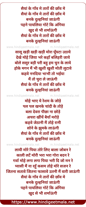 Lyrics of Saiyya Ke Gaon Me Taaro Ki Chaav Me - सैयां के गाँव मे तारों की छाँव में