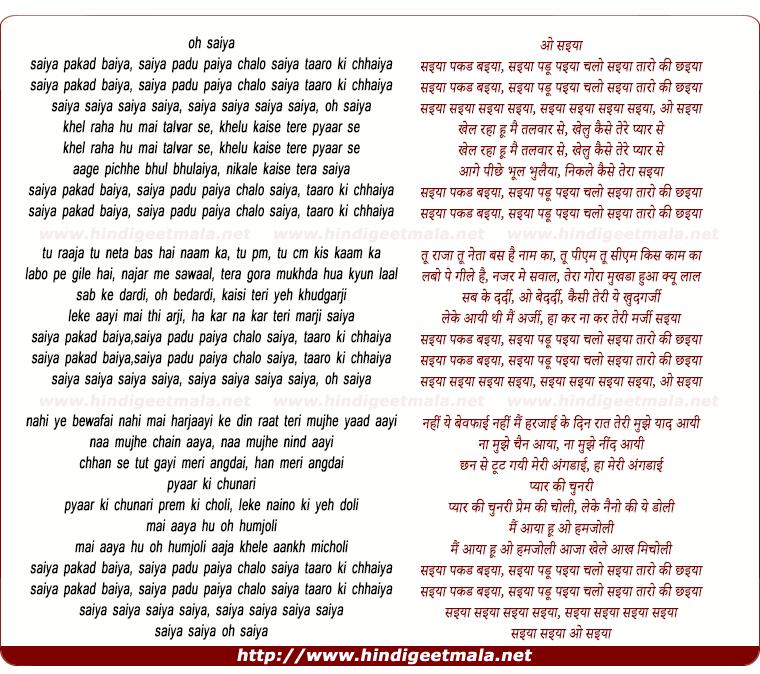Comments for lyrics of song "Saiyan Pakad Baiyan"
