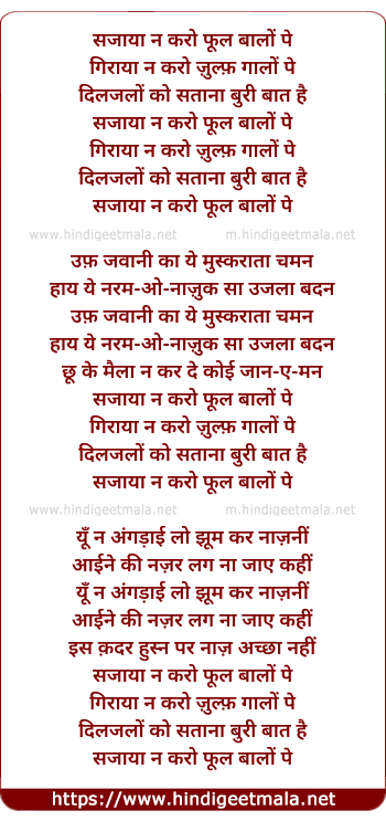 Lyrics of Sajaayaa Na Karo Phul Baalon Pe - सजाया न करो फूल बालों पे