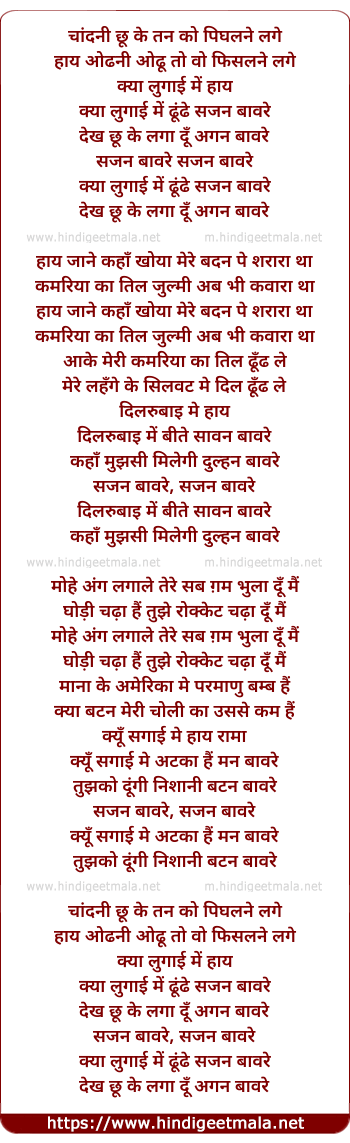 Lyrics of Sajan Bawre (Remix) - चांदनी छू के तन को पिघलने लगे