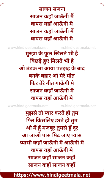 Lyrics of Sajan Kha Jaungi Main Vapas Yaha Aaungi Main - साजन कहाँ जाऊँगी मैं वापस यहाँ आऊँगी मै