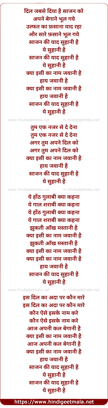 Lyrics of Sajan Ki Yaad Suhani Hai, Kya Isi K Naam Jawani Hai - साजन की याद सुहानी है, क्या इसी का नाम जवानी है
