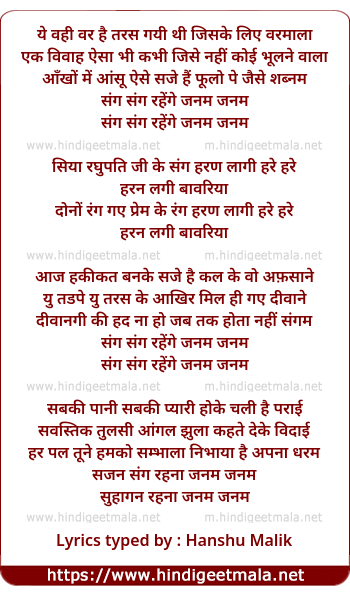 Lyrics of Sajan Sang Rehanaa Janam Janam - सजन संग रहना जन्म जन्म