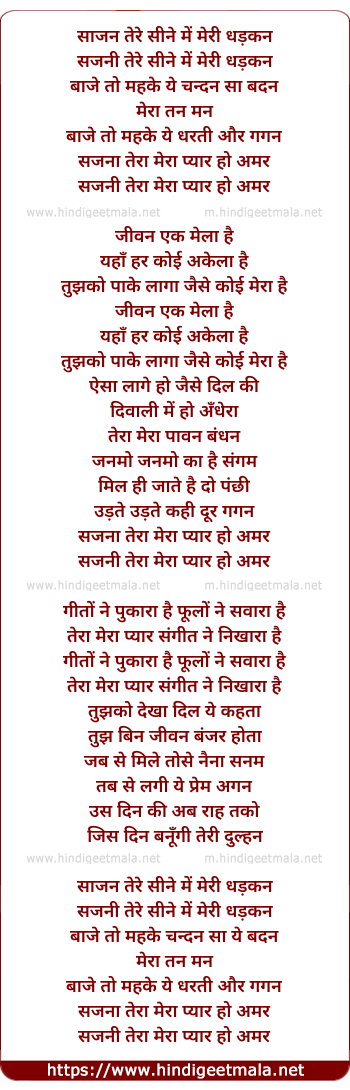 Lyrics of Sajan Tere Sine Me Meri Dhadkan - साजन तेरे सीने में मेरी धड़कन