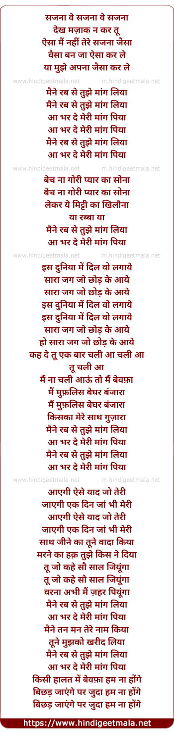 Lyrics of Sajanan Ve, Aa Bhar De Meri Maang Piya - सजना वे, आ भर दे मेरी माँग पिया
