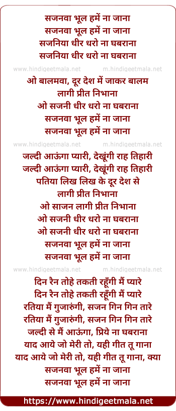 Lyrics of Sajanva Bhul Hame Na Jaana - सजनवा भूल हमें ना जाना