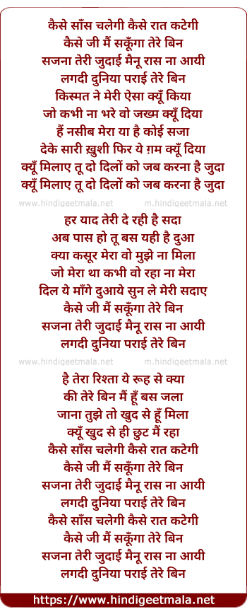 Lyrics of Sajanaa - कैसे साँस चलेगी कैसे रात कटेगी