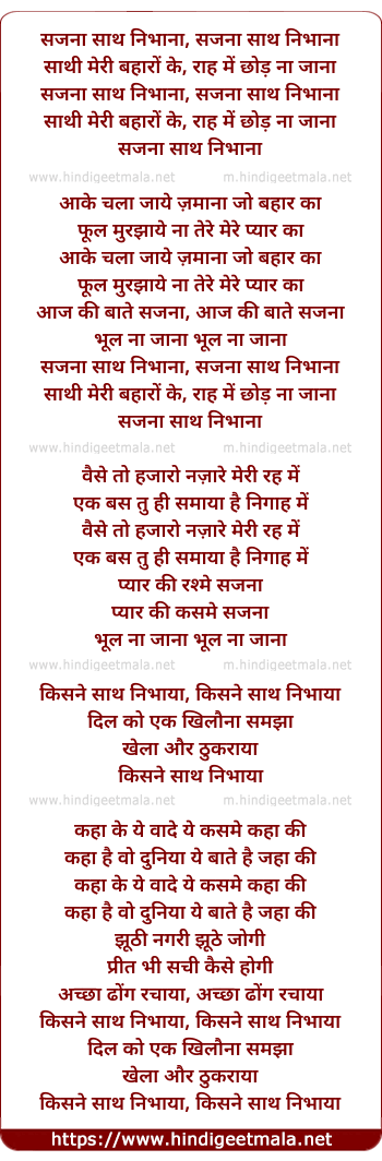 Lyrics of Sajna Saath Nibhana - सजना साथ निभाना