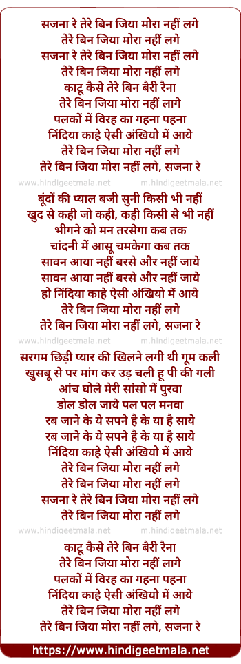 Lyrics of Sajna Tera Bina Jiya Mora Na Lage - सजना रे तेरे बिन जिया मोरा नहीं लगे