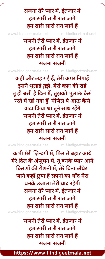 Lyrics of Sajna Tere Pyaar Mein - सजना तेरे प्यार में, इंतजार में
