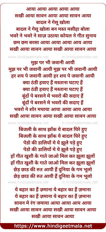 Lyrics of Sakhi Aaya Sawan Aaya - आया आया आया आया आया