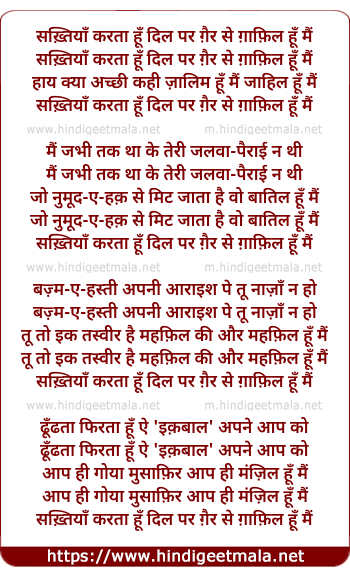 Lyrics of Saktiyaan Karataa Hun Dil Par - सख़्तियाँ करता हूँ दिल पर ग़ैर से ग़ाफ़िल हूँ मैं