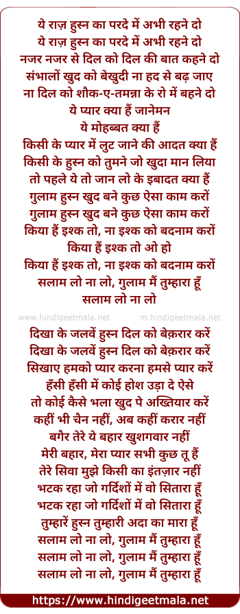 Lyrics of Salaam Lo Na Lo (2) - ये राज़ हुस्न का परदे में अभी रहने दो