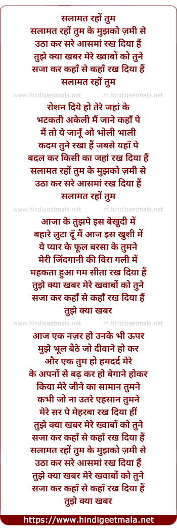 Lyrics of Salamat Raho Tum Ke Mujhko Jami Se Utha Ke - सलामत रहों तुम के मुझको जमी से उठा के