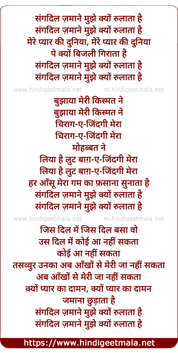 Lyrics of Sangdil Zamane Mujhe Kyo Rulata Hai - संगदिल ज़माने मुझे क्यों रुलाता है