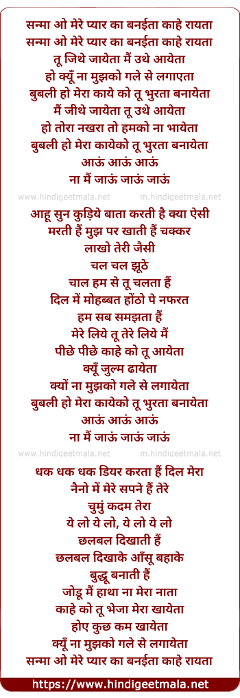Lyrics of Sanma O Mere Pyar Ka Banayta Kaahe Rayta - सन्मा ओ मेरे प्यार का बनईता काहे रायता