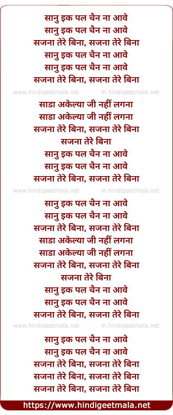 Lyrics of Sanu Ik Pal Chain Naa Aawe - सानु इक पल चैन ना आवे