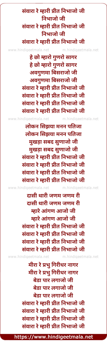 Lyrics of Sanwara Re Mhari Preet Nibhajo Ji - संवारा रे म्हारी प्रीत निभाजो जी