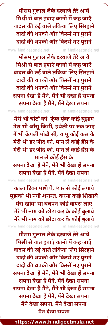 Lyrics of Sapnaa Dekha Hain Maine - मौसम गुलाल लेके दरवाजे तेरे आये