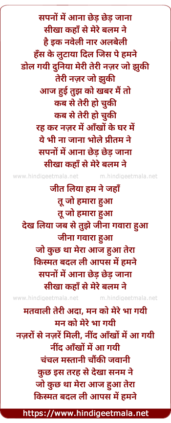 Lyrics of Sapno Me Aana Chhed Chhed Jaana - सपनों में आना छेड़ छेड़ जाना