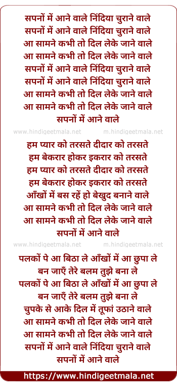 Lyrics of Sapno Me Aane Wale Nindiya Churane Wale - सपनों में आने वाले निंदिया चुराने वाले