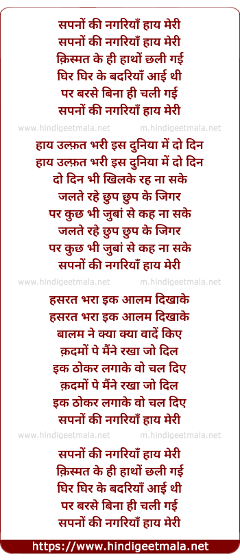 Lyrics of Sapnon Ki Nagariya Haay - सपनों की नगरियाँ हाय