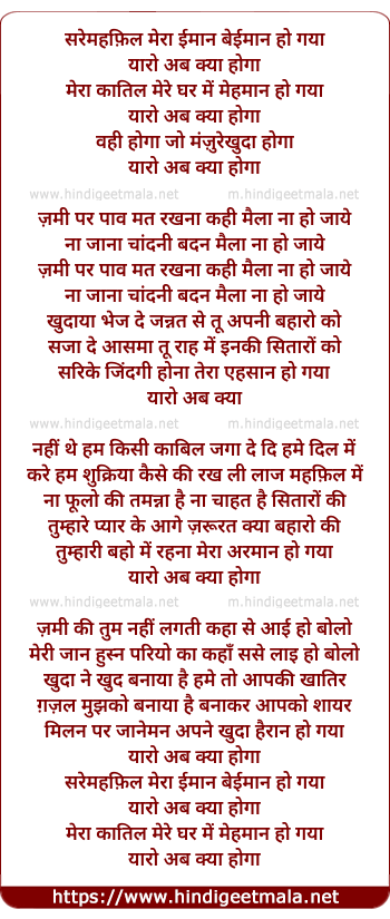 Lyrics of Sar E Mahafil Meraa Imaan, Yaaron Ab Kyaa Hogaa - सर ए महफ़िल मेरा ईमान, यारो अब क्या होगा