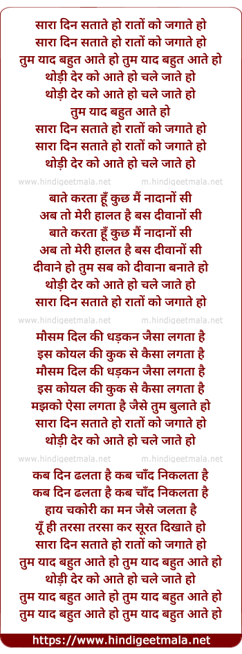 Lyrics of Sara Din Satate Ho Raato Ko Jagate Ho - सारा दिन सताते हो रातों को जगाते हो
