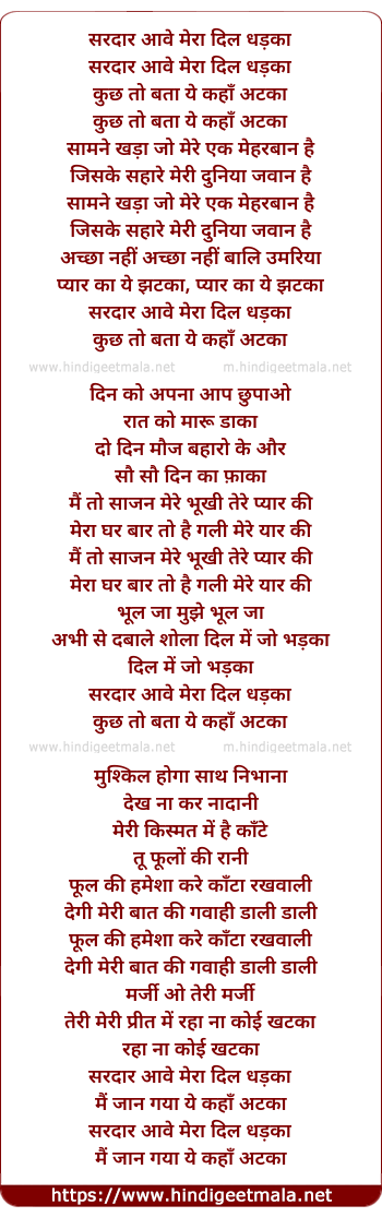 Lyrics of Sardar Ve Mera Dil Dharka - सरदार आवे मेरा दिल धड़का