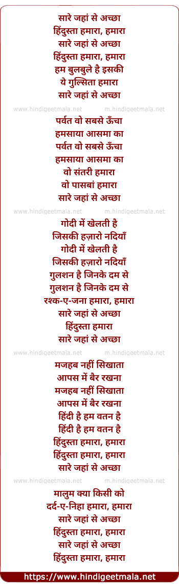 Lyrics of Sare Jahaan Se Achha - सारे जहां से अच्छा