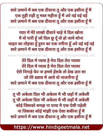 Lyrics of Sare Zamane Me Bas Ek Deewana Tu Aur Ek Hasina Hu Main - सारे ज़माने में बस एक दीवाना तू और एक हसीना हूँ मैं