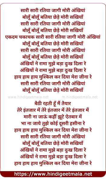 Lyrics of Sari Sari Ratiya Jagi Mori Ankhiyan - सारी सारी रतिया जागी मोरी अंखियां