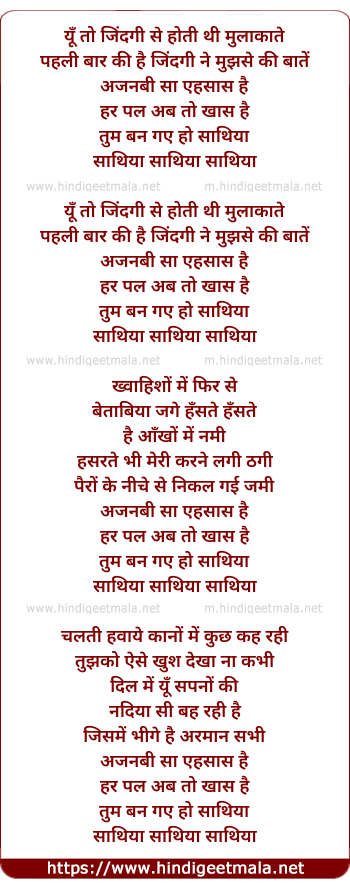 Lyrics of Sathia (Solo Version) - यूँ तो जिंदगी से होती थी मुलाकाते