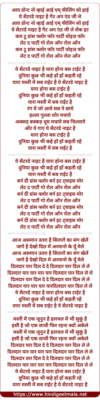 Lyrics of Saturday Night Hai - सैटरडे नाईट है