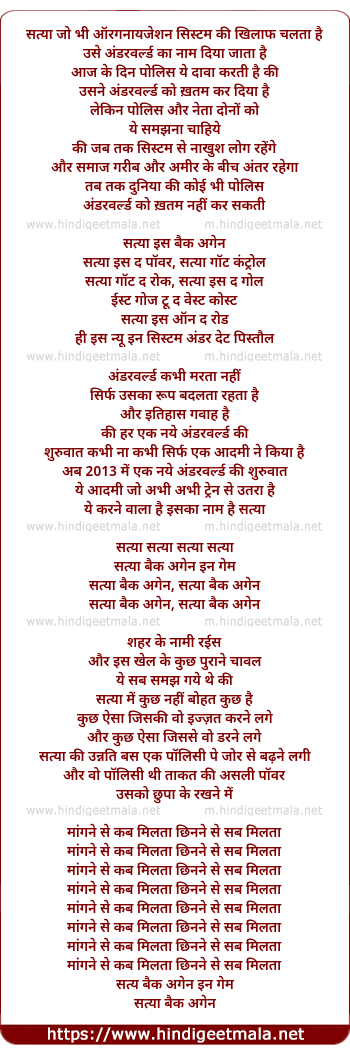 Lyrics of Satya Is Back Again - सत्या इज बेक अगेन