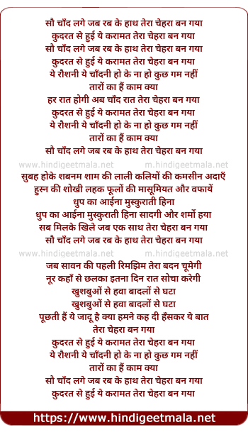 Lyrics of Sau Chand Lage Jab Rabke Hath - सौ चाँद लगे जब रब के हाथ तेरा चेहरा बन गया