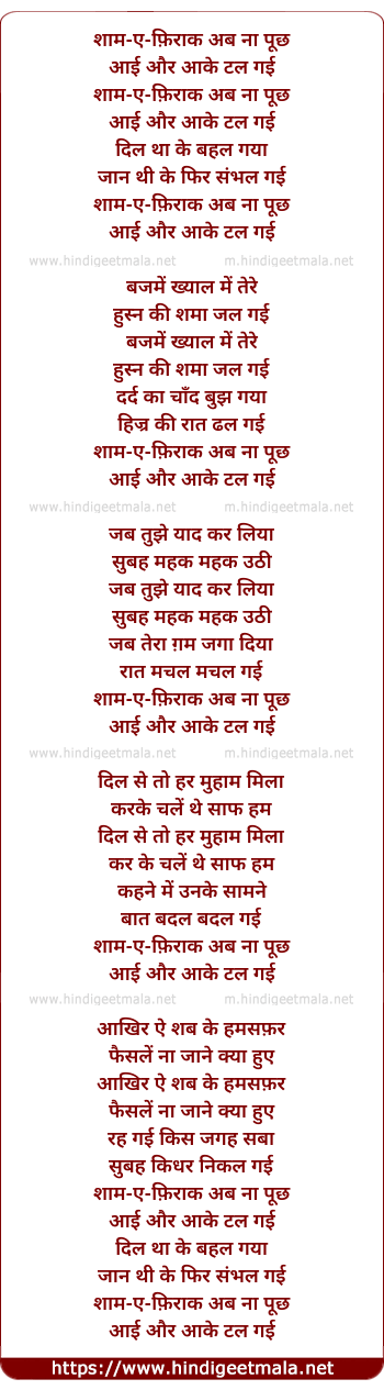 Lyrics of Shaam-E-Firaaq Ab Na Poochh - शाम-ए-फ़िराक अब ना पूछ