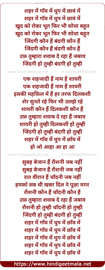 Lyrics of Shahar Me Ganv Me Dhup Me Chhanv Me - शहर में गाँव में धुप में छावं में