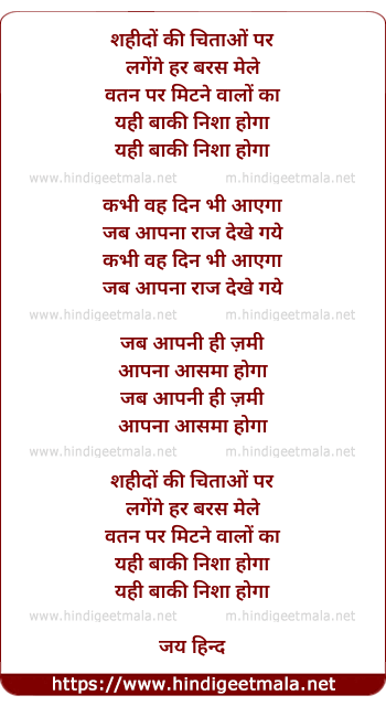 Lyrics of Shahidho Ki Chithao Par - शहीदों की चिताओं पर