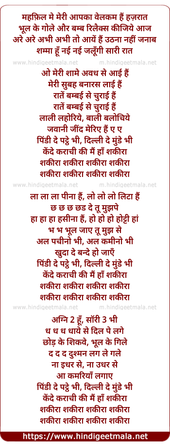 Lyrics of Shakiraa - शकीरा