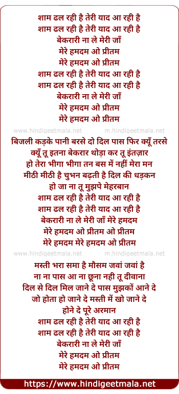 Lyrics of Shaam Dhal Rahi Teri Yaad Aa Rahi Hai - शाम ढल रही तेरी याद आ रही है